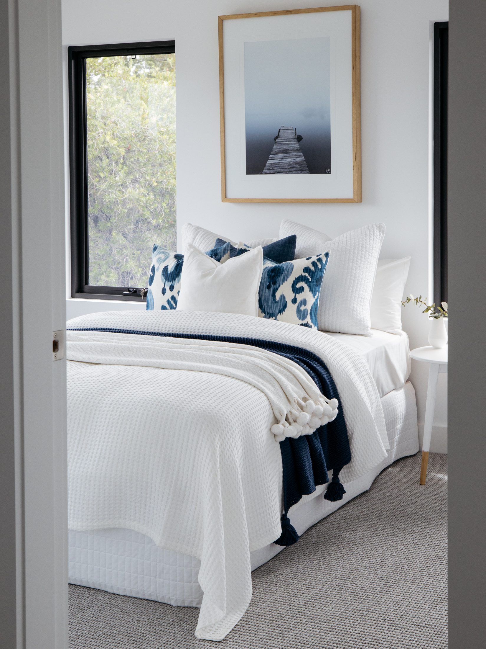 A vertical print is used as the centrepiece in bedroom styling