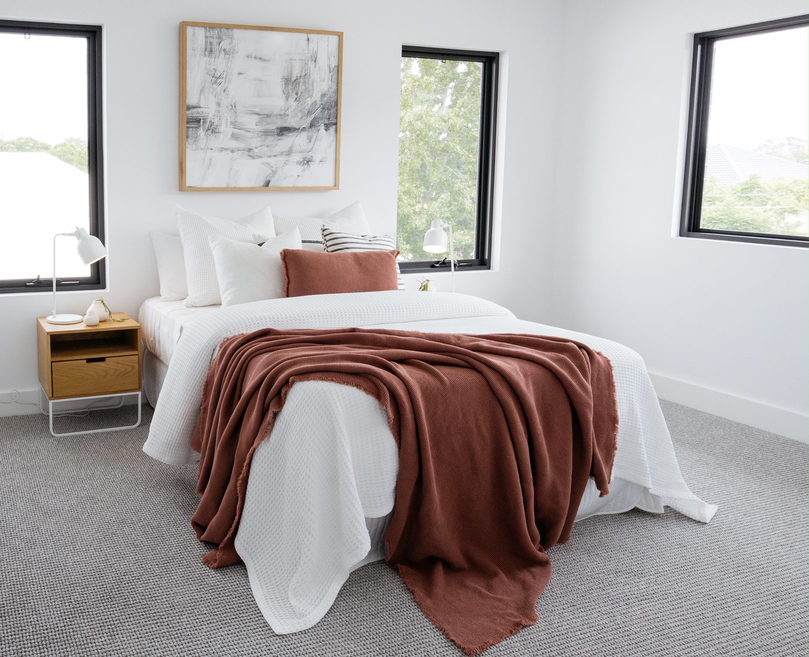 A splash of colour, timber bedside and modern art used in bedroom styling project
